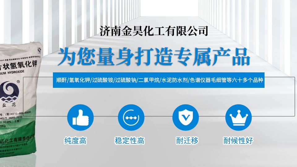 我公司是一家集、研发、贸易为一体的综合性化工公司。主要涵盖无机化工产品、化工产品、实验仪器等几大系列。主营产品为氢氧化钾、过硫酸铵、过硫酸钠、顺酐、二氯甲烷、水泥防水剂、色谱仪器毛细管等六十多个品种。产品主要用于农药、农肥、水处理、制药、造纸、冶金、建筑添加剂、橡胶制造等多个领域。 岁月不居,时节如流。公司于2006年成立,如今已十几个年头了。一路走来我们一步一个脚印,兢兢业业,诚信经营,如今公司已发展成为年销售额近陆仟万元...